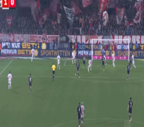 第41分钟,格纳布里失误被断,马伊纳带球反击远射破门!科隆1-0拜仁