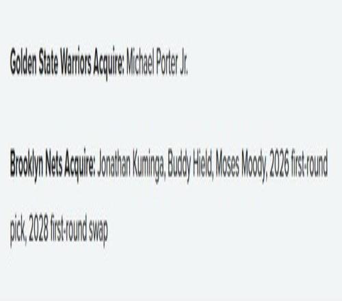 篮网得到:乔纳森-库明加、巴迪-希尔德、摩西-穆迪、2026年首轮签、2028年首轮签互换权